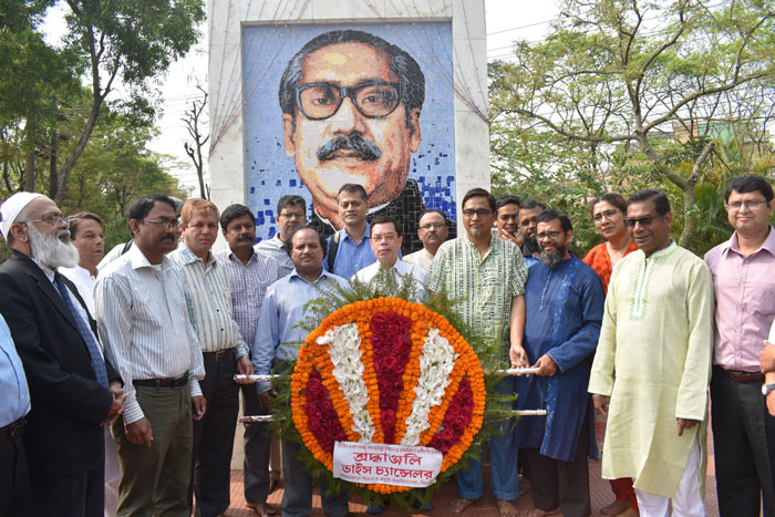 সকাল সাড়ে ৯টায় ভাইস চ্যান্সেলর প্রফেসর ফরিদ উদ্দিন আহমেদ ক্যাম্পাসে বঙ্গবন্ধুর প্রতিকৃতিতে পুষ্পস্তবক অর্পণ করেন। সকাল ৯টা ৪৫ মিনিটে বিশ্ববিদ্যালয়ের শিক্ষক-শিক্ষার্থী এবং কর্মকর্তা ও কর্মচারীবৃন্দের অংশগ্রহণে ক্যাম্পাসে আনন্দ র্যালি অনুষ্ঠিত হয়। র্যালি শেষে প্রশাসনিক ভবনের সম্মুখে সংক্ষিপ্ত বক্তব্যে ভাইস চ্যান্সেলর বলেন, বঙ্গবন্ধুর স্বপ্নের সোনার বাংলা গড়তে আমাদের প্রত্যেককে নিজ নিজ দায়িত্ব সঠিকভাবে পালন করতে হবে। আর আমরা যদি সঠিকভাবে কাজ করতে পারি তাহলে আমরা ২০৪১ সালের মধ্যে উন্নয়নশীর দেশগুলোর মধ্যে শীর্ষে অবস্থান করতে পারব